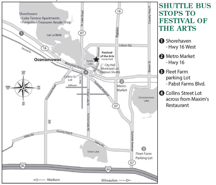 Once again, a free pontoon shuttle service will be available. Departures will be every twenty minutes from the city boat launch on Fowler Lake, in the municipal parking lot just north of City Hall. The pontoon shuttle ride is approximately 10 minutes in duration.